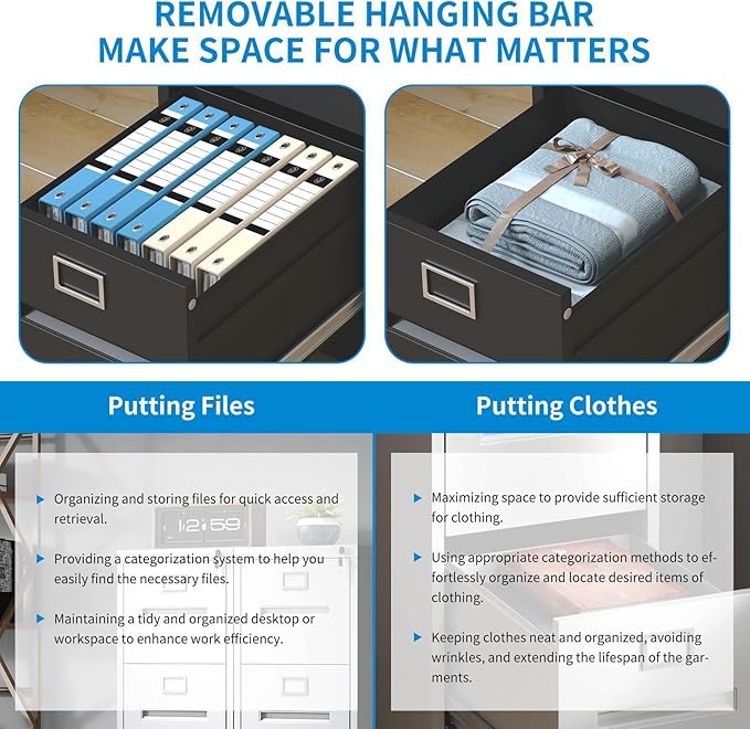 - 【Space-Saving & Versatile】This vertical file cabinet is designed to maximize storage capacity while minimizing the space it occupies. Its compact design allows it to fit seamlessly into tight corners or narrow spaces, providing ample storage without cluttering the room.The adjustable hanging rod in each drawer allow you to customize the interior to suit your specific needs, whether you're storing A4, letter, or legal-size documents.
