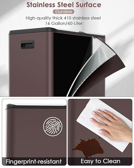 - Dual 8 gallon Compartment Bins: Trash can measures 20.3in * 14.6in * 26.2in. With a large capacity of 60 liters, it offers plenty of room for garbage and recycling, Combo garbage bin comes with two removable inner barrels, and each compartment has an independent lid and a widened pedal, which effectively isolates the smell of garbage and facilitates the opening of each compartment.
