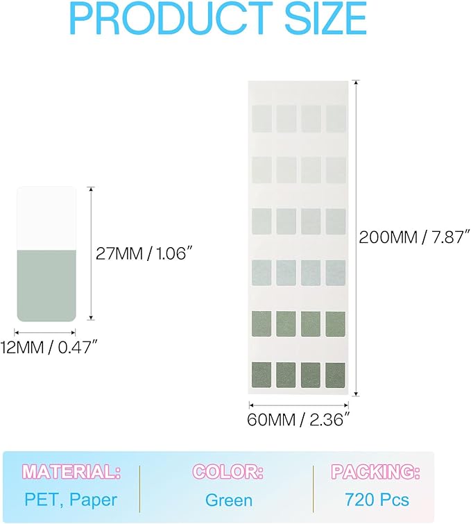 - Material: PET, Paper; Style: Gradient Green; Color: Green; Index Tab Size: 27x12x0.2mm/1.06x0.47x0.01inch(LxWxH); Tab Sheet Size: 60x200mm / 2.36x7.87inch; Package Includes: Index Tab Stickers x 720