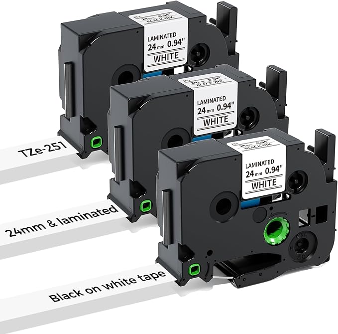 - 3-Pack compatible with brother p touch 24mm 0.94 inch laminated white label maker tape, TZe-251 TZe251 TZ 251 label tape refill
