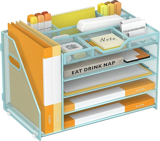- Layers for Sorting and Storage-This OrgMate blue file organiser features a multi-modular design with 5 tiers trays to neatly store files, papers, books, and accessories. The top tier is divided into 7 sections for versatile organisation, while the included File Holder provides additional vertical storage for frequently accessed documents. Modular dividers allow custom adjustments, transforming it into your ideal office companion