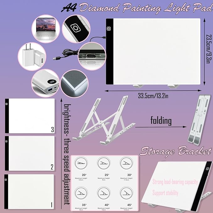 - USB A4 diamond painting light pad: The 3 speed adjustable brightness design allows you to adjust the brightness according to different usage needs, making the numbers and symbols on diamond paintings more prominent and improving work efficiency. It can also be used for different projects, such as diamond painting, drawing, tracing, etc. The lightweight and ultra-thin design makes the lightweight board easy to carry, allowing you to easily move around in your workspace.