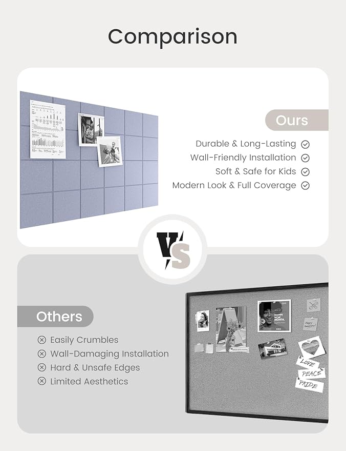 - 【Felt Bulletin Board – 12 Tiles Included】 Includes 12 felt cork boards (each 11.8" x 11.8") with 30 Pushpins that can be freely arranged into a large display board. Perfect for showcasing your schedules, ideas, and creations in home or office settings.