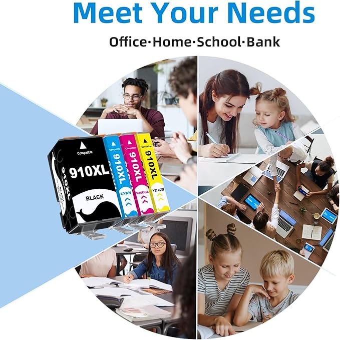 - Package Content: 910xl black ink, 910xl cyan ink, 910xl magenta ink, 910xl yellow ink (black and color combo pack, totally 4 packs 910 ink cartridges).