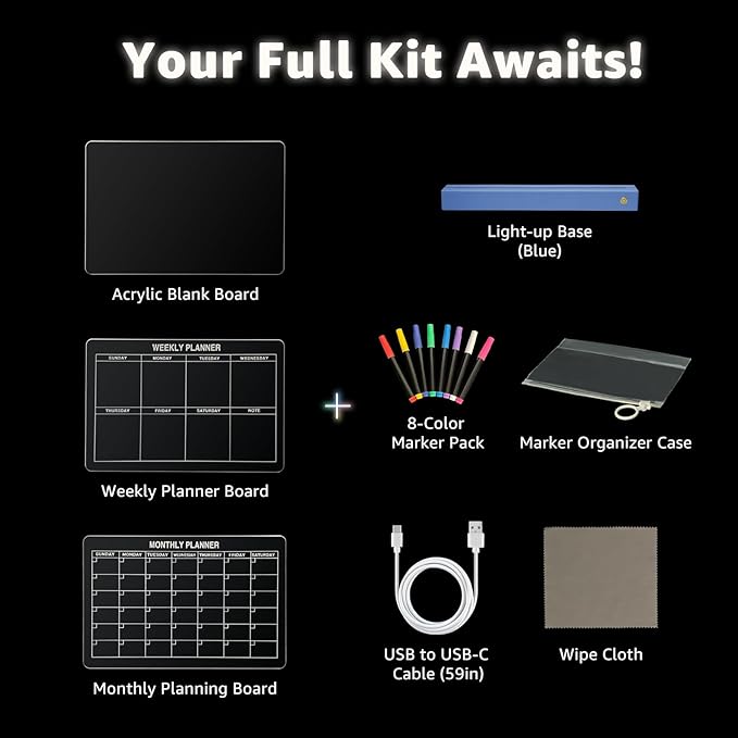- Complete Ready-to-Use Kit: Includes glowboard - led light-up writing & drawing board main unit, 3 clear dry erase board with light panels, 1 sturdy touch base, 8 colored dry-erase markers, 1 transparent pen pouch, 1 cleaning cloth, and a 1.5m USB to Type-C cable. Start creating instantly on your light up boards to write on.