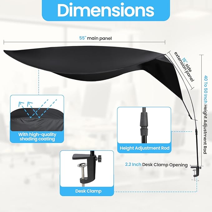- The height of the shading panel can be freely adjusted between 40 and 50 inches, easily adapting to different office scenarios and individual shading needs. Equipped with a 360° rotatable canopy, the angle can be flexibly adjusted, enabling you to achieve the ideal shading and comfortable office experience