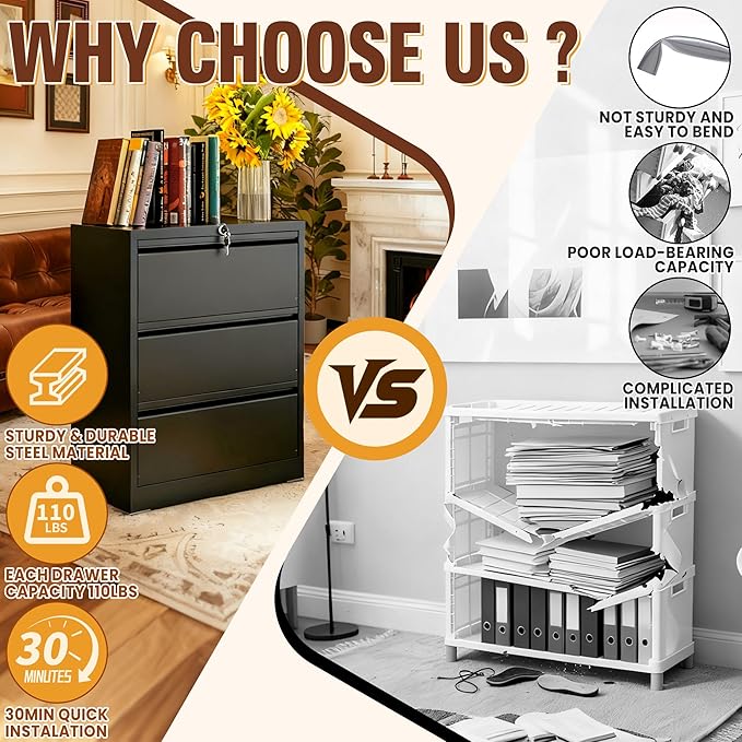 3-Drawer Lateral File Cabinet with Lock, Black Metal Filing Cabinet for Office or Home – Secure Storage for Letter/Legal/A4/F4 Documents, Easy to Assemble Locking File Organizer (Black, 3 Drawer-40"H)