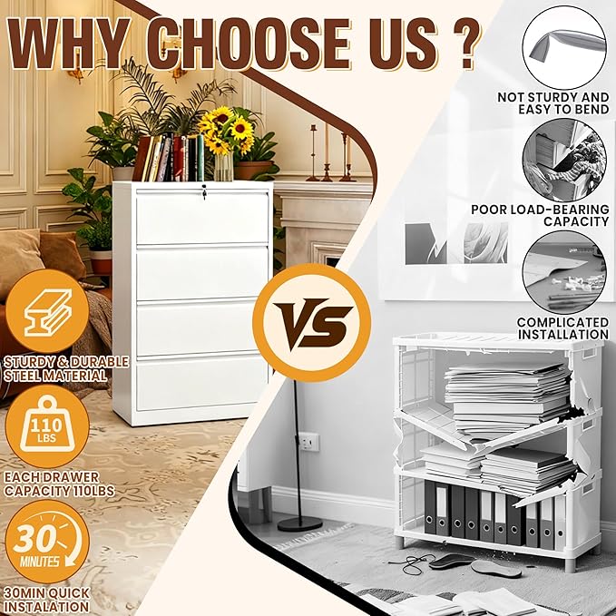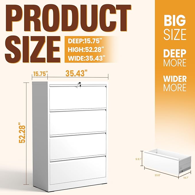 4-Drawer Lateral File Cabinet with Lock, Black Metal Filing Cabinet for Office or Home – Secure Storage for Letter/Legal/A4/F4 Documents, Easy to Assemble Locking File Organizer (White, 4 Drawer-52"H)