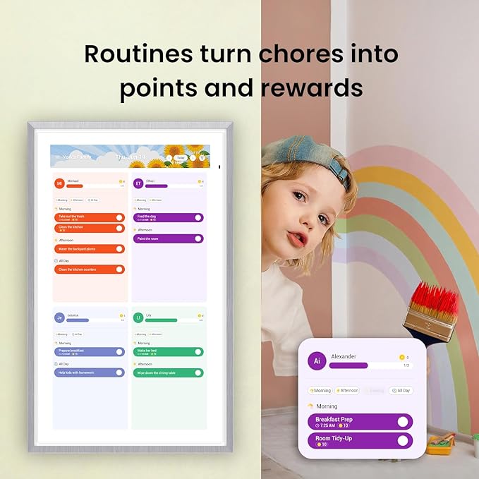 - Smart Photo Frame & Live Screensaver — The 27" HD touchscreen eCalendar displays memories from Google Photos, videos, schedules, or clocks and more, no subscription needed. Anti-glare glass reduces eye strain; Auto Brightness and Sleep Mode save energy.