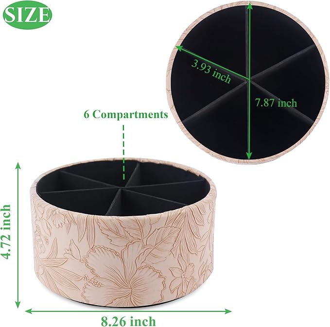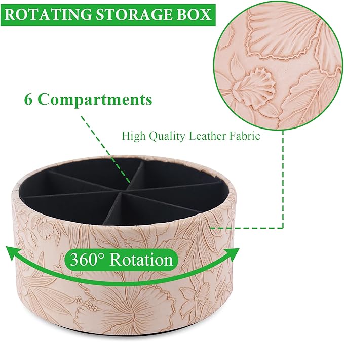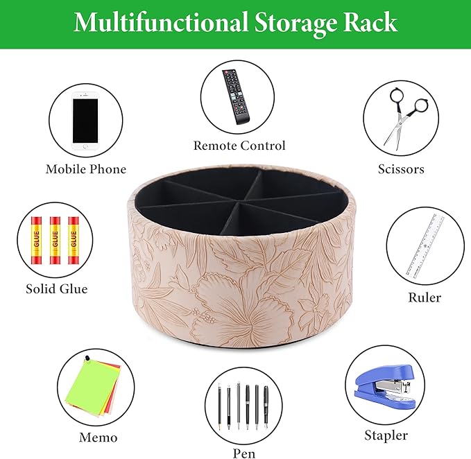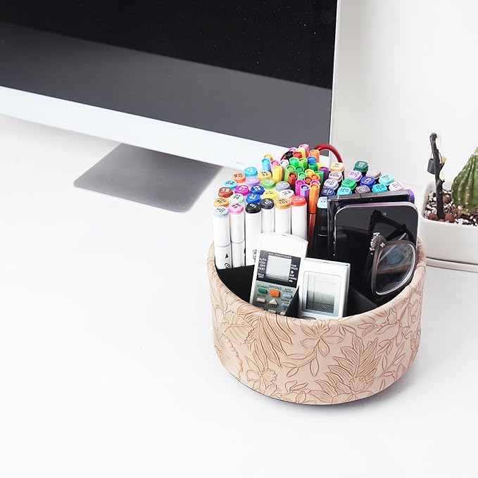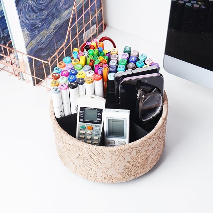 Hennaja Remote Control Holder, 360°Spinning PU Leather Desk TV Remote Caddy,Desk Storage Box Room Accessories for Controller, Media,Mail,Calculator, Mobile Phone,Pencil(1-Carved Light Brown)