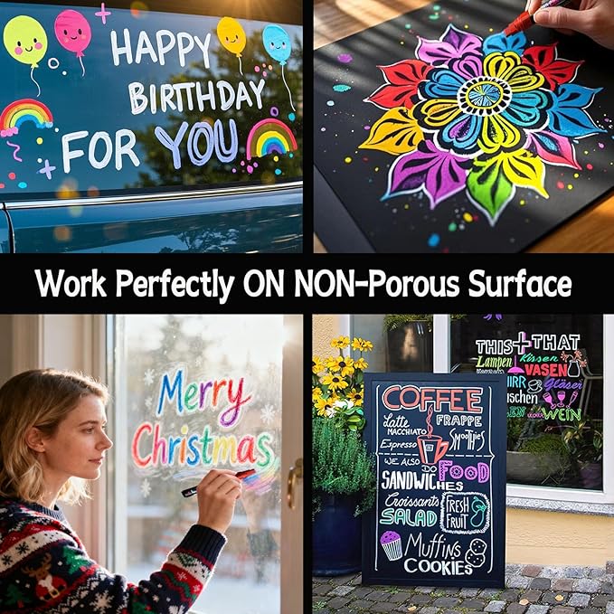 - Versatility: Use chalk markers to make your writing or drawing stand out. These vibrant chalkboard markers make bright marks on chalkboards, light boards, whiteboards, windows, glass, and more. These large chalk marks demonstrate their versatility on any non-porous surface. Rely on these markers for eye-catching presentations or writing in classrooms, businesses, or homes. Ideal for car decorations, whiteboards, blackboards, pub boards, Christmas banners, posters, and various DIY crafts.
