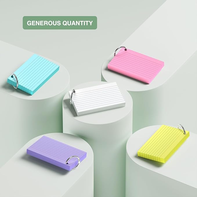 250-Pack Colored Index Cards, 3x5 Inch w/Key Ring – 180gsm Heavyweight Flashcards – 5 Vibrant Colors Flash Cards (White Pink Purple Blue Yellow) – Perfect for Study, Notes & Memory, Students School