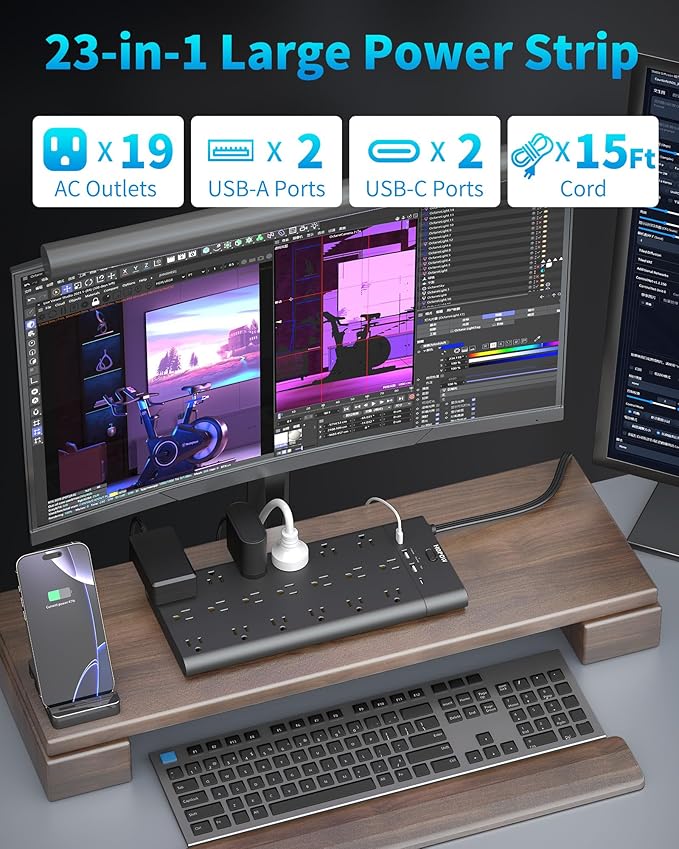 - 【23-in-1 Power Strip】 This large power strip features 19 AC outlets and 4 USB ports (including 2 USB-C), making it the great surge protector power strip for your home or office. Charge multiple devices, including laptops, phones, and tablets, simultaneously with ease.
