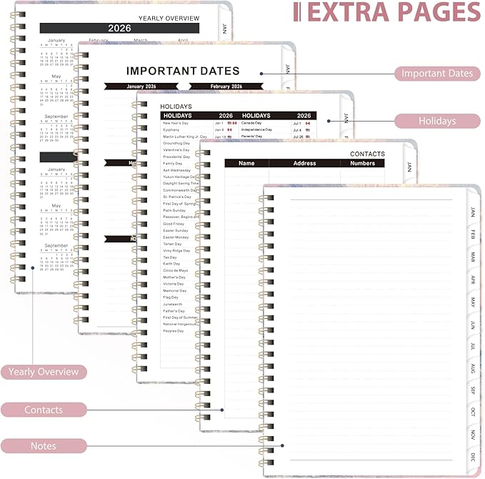 - [THOUGHTFUL DESIGN] – Boasting a secure elastic band, easy-to-use monthly tabs, and a handy double-sided pocket, the agenda 2026 also includes a unique motivational quote on each monthly spread to fuel your productivity.
