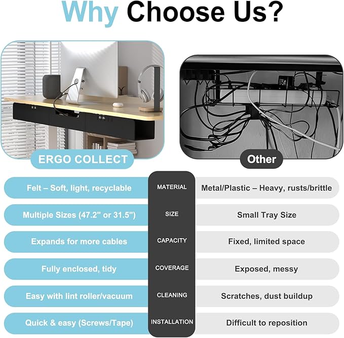 - SPACIOUS CABLE STORAGE – This extra-long felt cable management tray measures 47.2"×4.5"×3.7" and holds up to 20lb. It doubles as a power strip holder, easily storing multiple cables, adapters, and surge protectors. Includes 10 cable ties for a cleaner, more organized workspace