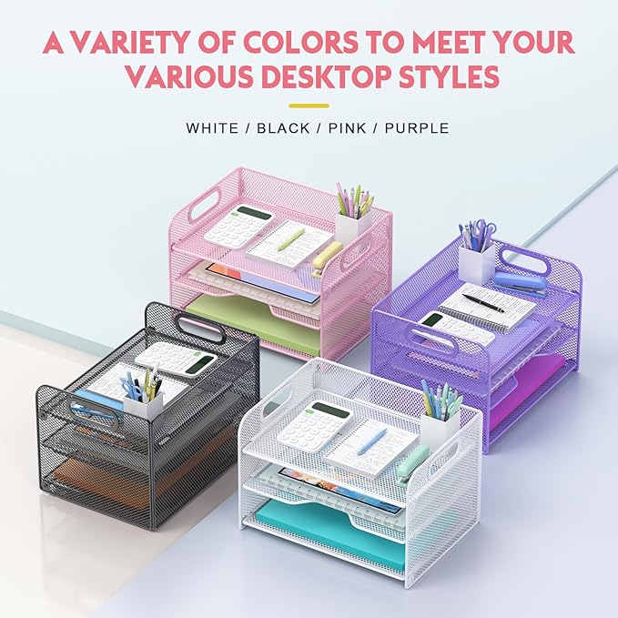 - NEW Updated Handle Design: The desk organizer comes with handles, makes it easier to move.Also the paper tray comes with 2 metal bars to reinforce, which makes it more sturdy and much easier to assemble.