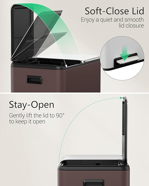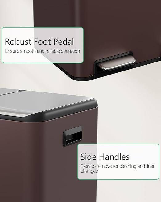 - Hand-Free Use: Dual trash can with stainless steel foot pedal brings convenience. With instant response to light foot taps, you can effortlessly toss trash, even when hands are full. Sturdy wide pedals stand up to daily use, ensuring smooth, reliable operation for years to come