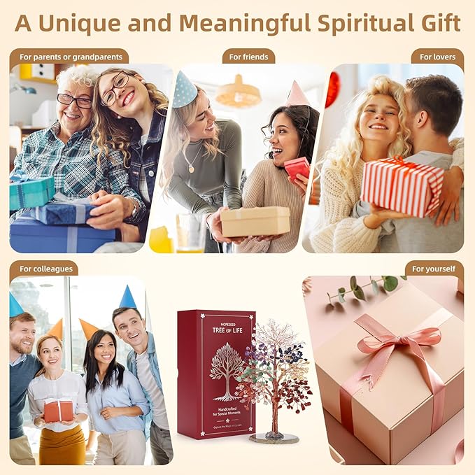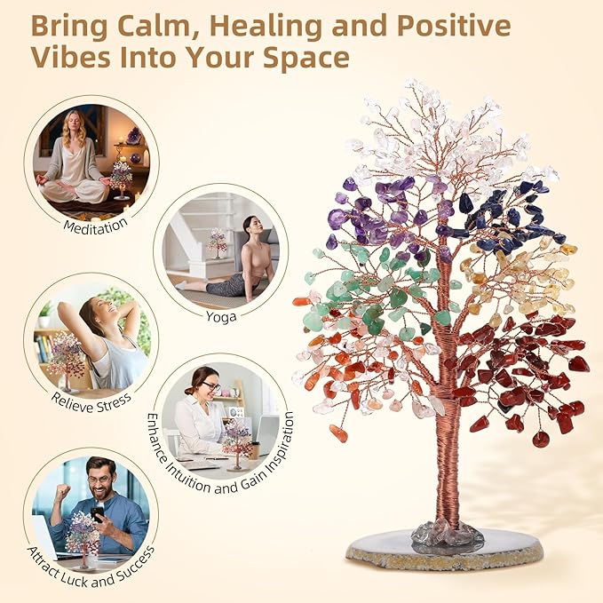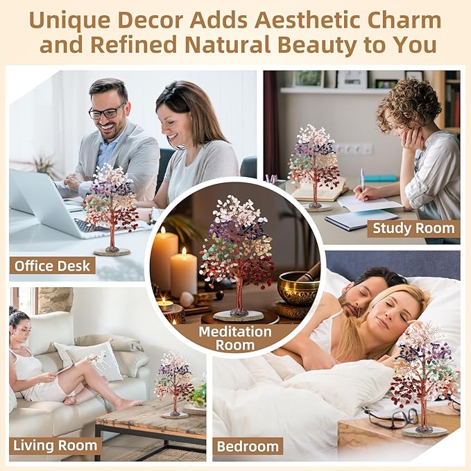 - A Meaningful Spiritual Gift: Both thoughtful and deeply symbolic, this Chakra Crystal Tree makes an exceptional gift for friends, family, or anyone who values healing energy and could use a boost of encouragement. It's also a perfect way to express heartfelt wishes for anniversaries, birthdays, Christmas, Mother's Day, Father's Day, retirement, housewarmings, or any special occasion. Place your crystal tree on a desk, in the living room, bedroom, bookshelf, or office as decor.