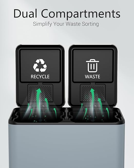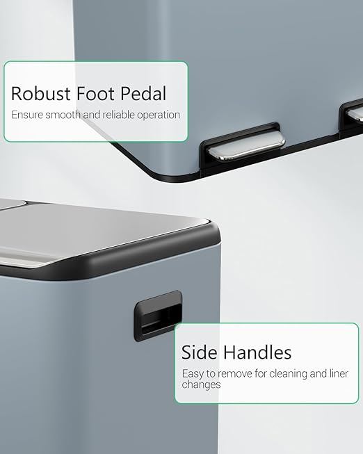 - Hand-Free Use: Dual trash can with stainless steel foot pedal brings convenience. With instant response to light foot taps, you can effortlessly toss trash, even when hands are full. Sturdy wide pedals stand up to daily use, ensuring smooth, reliable operation for years to come