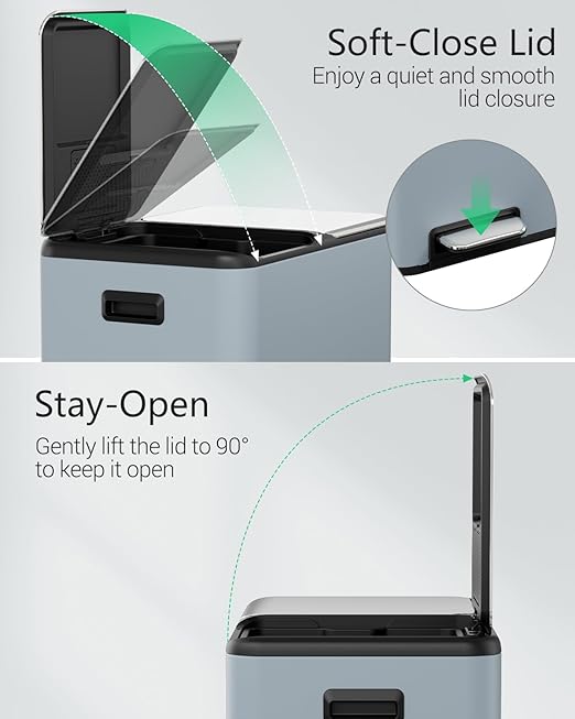 - Quiet Closure: Soft-close mechanism allows lid to close slowly and silently, reducing unwanted noise and creating a peaceful atmosphere. Gently lift the lid to 90°, and it will stay open as long as you need, making your waste disposal a breeze