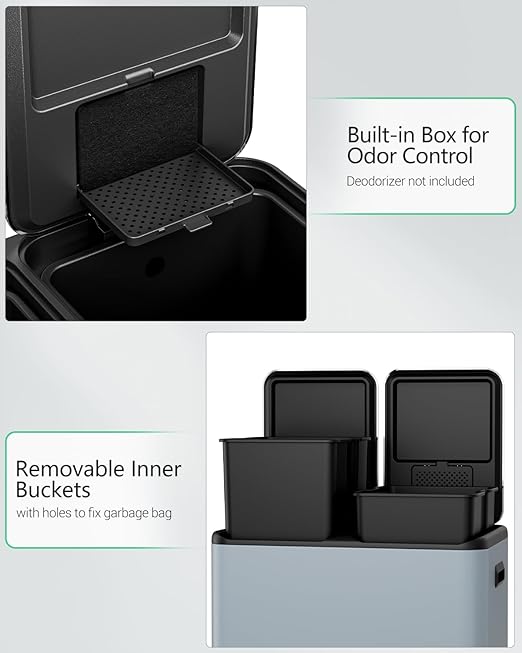 - Odor Control System: Trash and recycle bin combo is equipped with built-in box on each lid. Simply store cleaning materials to reduce smells. In addition, airtight seal design locks in smells. Just say goodbye to unpleasant garbage odors, and enjoy a clean environment