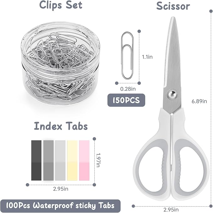- PACKAGE INCLUDES: 1x White Stapler, 1x White Staple Remover, 1000x Staples, 1x White Tape Dispenser, 1x White Office Scissor, 150 x Paper Clips with Box,5 Colors Waterproof Sticky Tabs