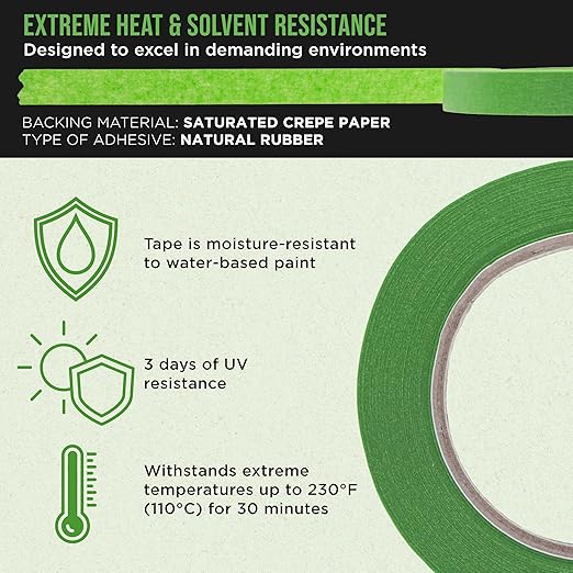 - Extreme Heat & Solvent Resistance: Designed to excel in demanding environments, this tape withstands extreme temperatures up to 230°F (110°C) for 30 minutes, making it ideal for paint baking cycles in spray booths and the use of infrared heat lamps. Its natural rubber adhesive and waterproof green backing also provide exceptional solvent resistance to resist paint bleed-through. The tape is moisture-resistant to water-based paint and offers 3 days of UV resistance.