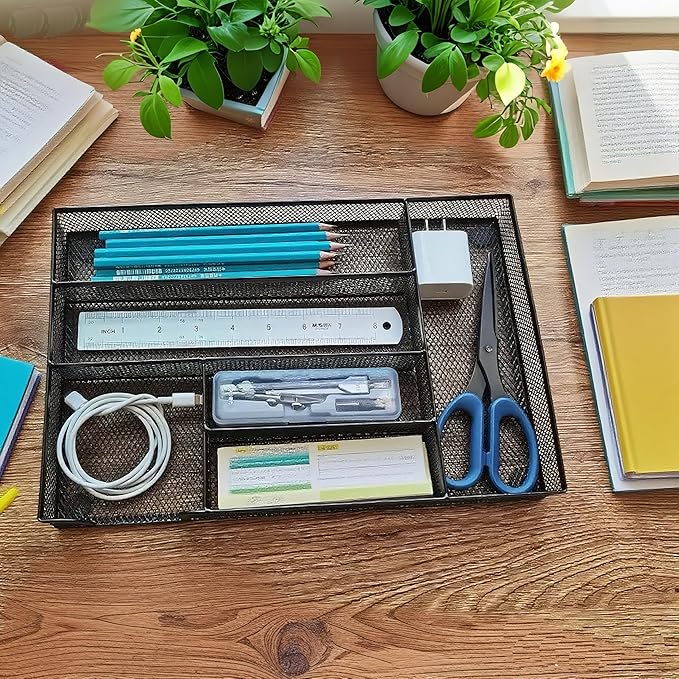 Desk Drawer Organizer Metal Mesh Drawer Organizer Tray for Office School or Home Supplies Desktop Storage Stationery,6 Compartments, 12.6 x 8.27 x 1.57 inch,Black (1pc pack)