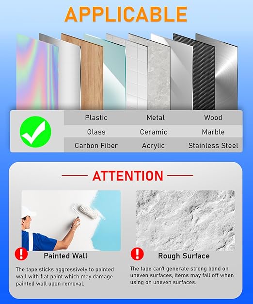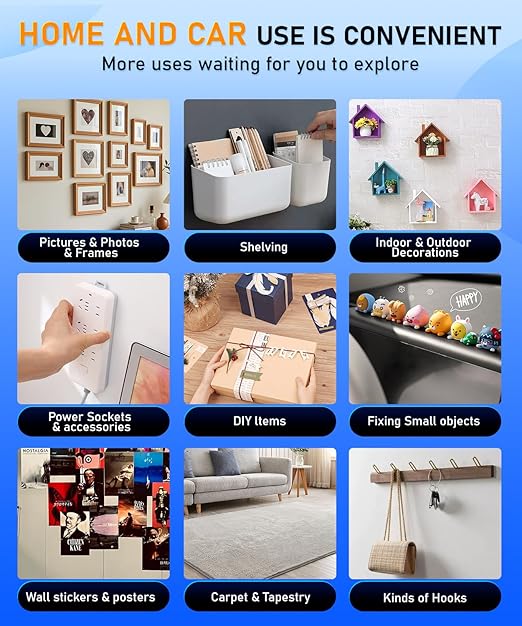 - ππͺπ₯ππ§ ππ©π§π€π£π πΌππππ¨ππ€π£, ππ€ πΏπ§ππ‘π‘ππ£π: Engineered with advanced adhesive technology, this heavy-duty tape securely holds items without screws or drills. It effortlessly supports pictures, photo frames, hooks, and more, while protecting your walls from damage.