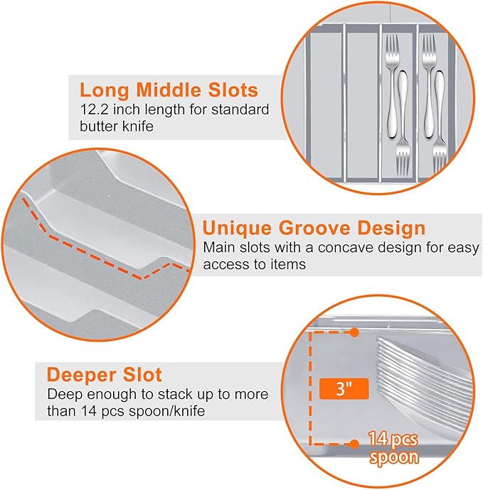 - Maximize Drawer Space: With our 3-way expandable design, this gray silverware organizer offers unparalleled flexibility, allowing for left, right, and upward expansion. This transforms it from a compact tray to a full-sized storage solution. All the edges are thinner than those of other cutlery drawer organizer, which magnifies your kitchen drawer storage space