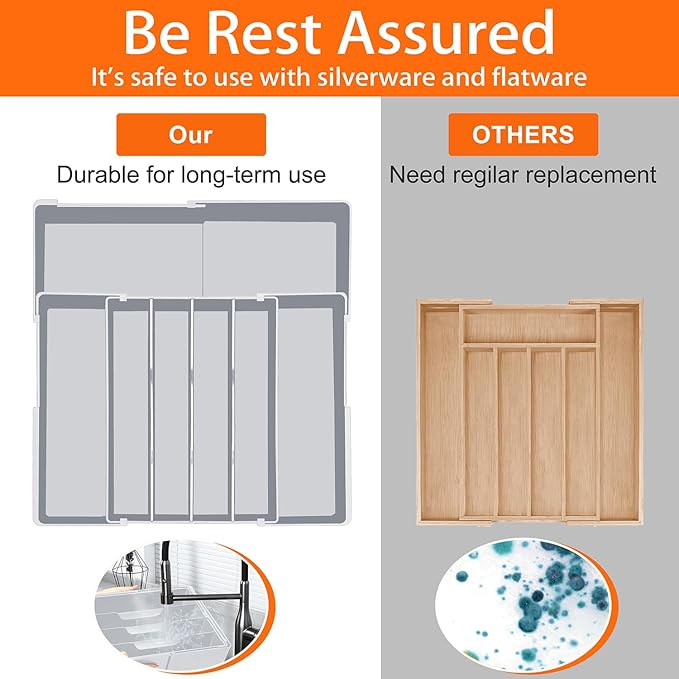 - Durable & Safe Material: Crafted from food-safe ABS plastic material, this utensils drawer organizer is BPA-free, shatter-resistant, waterproof, and built to last. Our cutlery tray's smooth edges protect utensils from scratches, while the sturdy construction withstands daily use—making it a reliable drawer utensil organizer for years to come