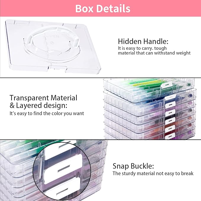 - 【User-Friendly Design】①Our gel pen storage box comes with a handle for easy carrying. ②Transparent barrels allow you to monitor the ink level and identify the color efficiently. ③The pen clip on the lid enhances the aesthetics and non-slip function.