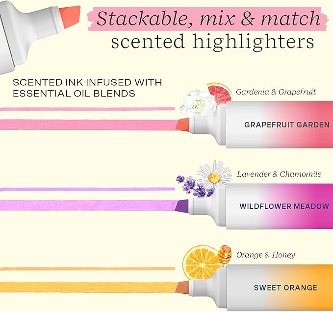 - Scented, Stackable Highlighters: Infuse some fun and relaxation into your studying with these Lifelines Scented Stacking Highlighters. Includes three stackable, mix & match highlighters in 3 delightful colors and scents – Grapefruit Garden, Sweet Orange, and Wildflower Meadow.