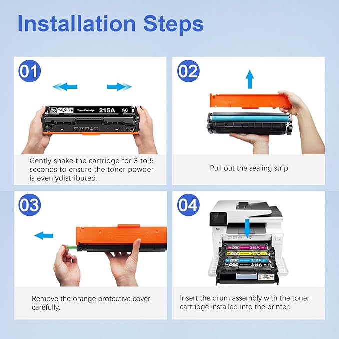 - WHAT'S IN THE BOX: 4 Packs 215A toner cartridges contain 1 x W2310A 215A black toner cartridge black , 1 x W2311A 215A cyan toner cartridge, 1 x W2312A 215A yellow toner cartridge, 1 x W2313A 215A magenta toner cartridge. (WITH CHIP)