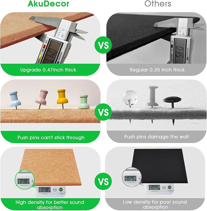 - 【Thickened Cork Boards】Our cork board alternatives have higher thickness (25% thicker) and density (35% denser) than traditional cork boards, which means better durability and sound absorption. It prevents push pins from sticking through the felt board and damaging the wall.