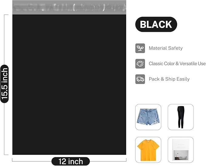 - Black 12x15.5 Poly Mailers - Our premium poly mailers are a trusted and reliable shipping solution for your business needs. Each envelope measures 12" x 15.5" and is designed to provide superior protection for your products during transit. And the price of 1500pack mailers are more affordable