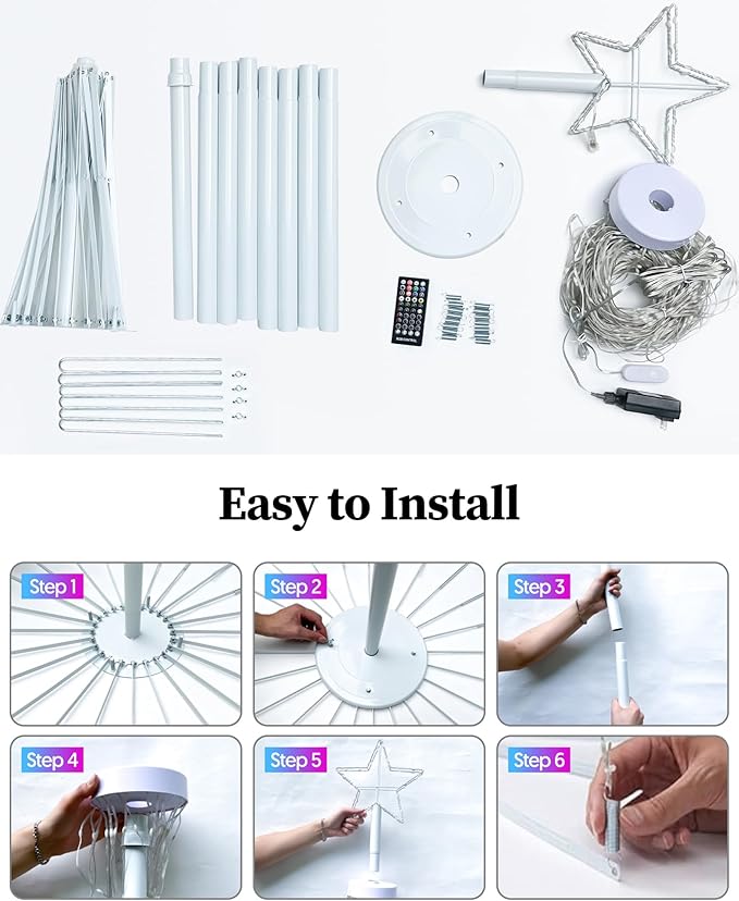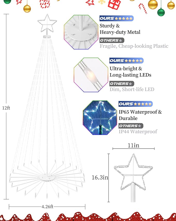 - DIY Lighting & Multi-scene Modes: Personalize your LED outdoor Christmas tree’s appearance with 16 million color combinations and multiple dynamic scene modes through the app. Each LED acts as an individual pixel, enabling you to design unique light displays that reflect your style. Ideal for creating a festive atmosphere and present an impressive light show during Christmas, parties, or special events like weddings and birthdays