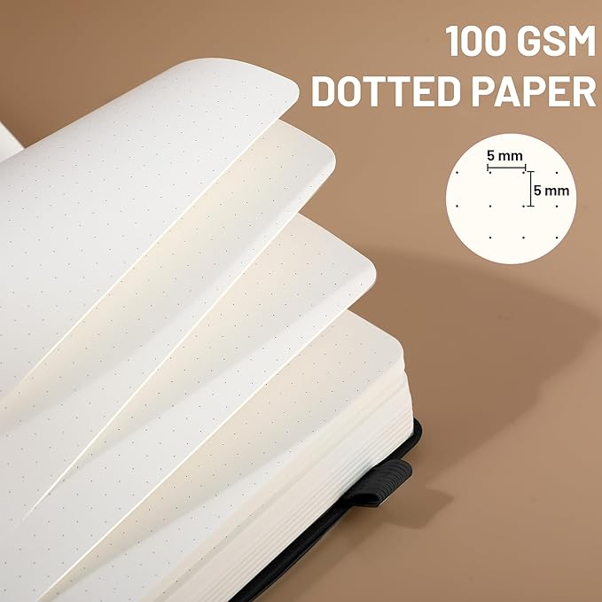 - 320 PAGES PREMIUM PAPER- Crafted from 100 gsm thick acid-free paper, it perfectly captures your thoughts while effectively preventing ink bleed-through. The dot matrix design offers subtle visual cues that maintain page layout and alignment while preserving near-blank-canvas creative freedom