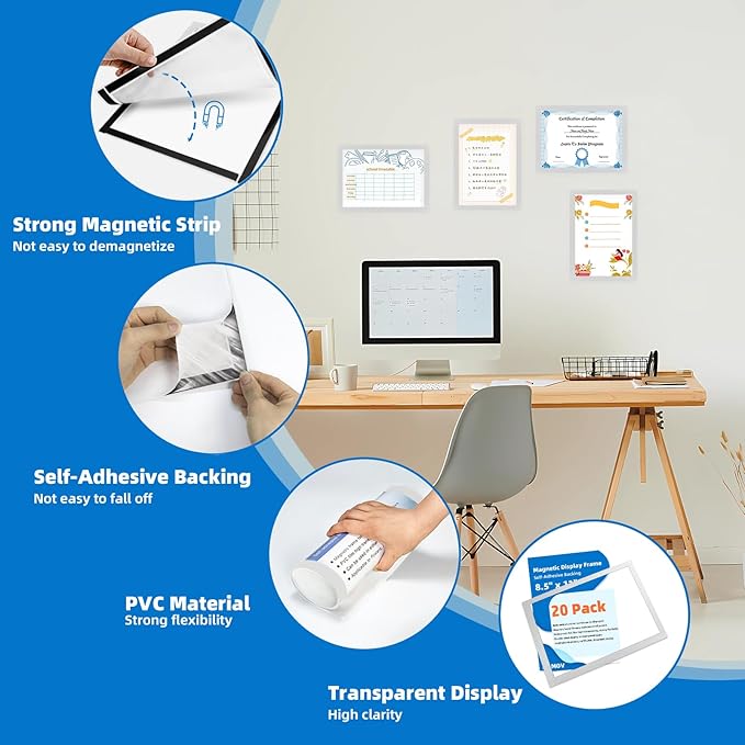- Multi-Purpose Magnetic Page Holder: The magnetic display frame 8.5 x 11 is widely used in store, home, office, school, restaurant, factory, hotel for displaying poster, certificate, price list, photo, memo, etc. Includes 20 pack reusable adhesive frames
