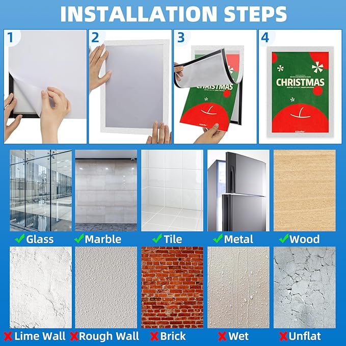 - Double-Sided Display: The magnet frames for refrigerator is made of durable PVC material, which is highly clear and waterproof. Double-sided visibility design of window sign holder allows people to view posters from both sides on any transparent surface