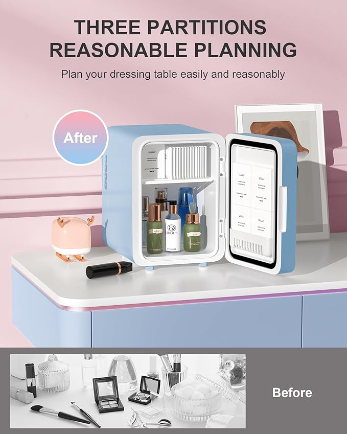 - Ultra-low Decibels in Operation: The new noise reduction technology makes the skincare fridge reduce to 25 dB less disruptive to work and everyday life, It ensures that your environment keep quiet whether in the bedroom, office, or baby's room.