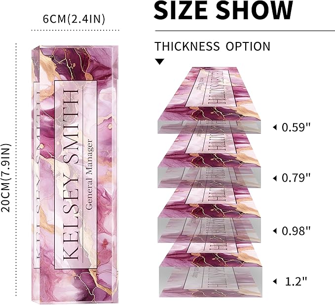 - 【High-Quality Acrylic Material】Our factory uses high-quality solid acrylic blocks to make name plates, and uses the latest high-definition UV printing machine to ensure that the content on the acrylic name plate is clear and not easily faded. So it will stand out on any desk, fully reflecting your professional ethics.