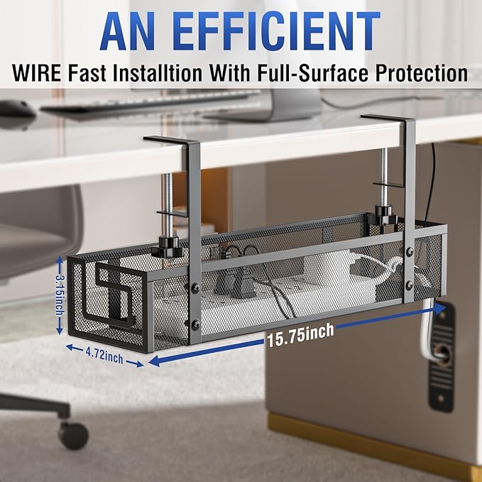 - 【Durable & Heavy-Duty Construction】Made of premium carbon steel, this cable management under desk features a reinforced metal mesh and a sturdy bottom. It supports up to 15lbs and measures 15.75" Lx4.72" Wx3.15" H, ensuring reliable and long-lasting use.