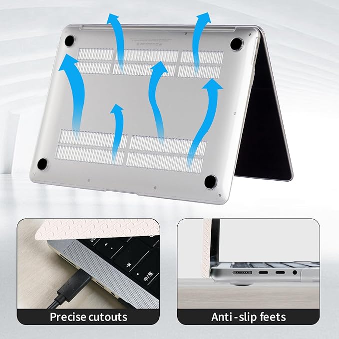 - Fully access, Staying cool: Thoughtfully designed cutouts ensure easy access to all ports and features. This mac book air 15 inch 2024 case allows you to open the screen to pass over 120 degrees, providing a smooth and hassle-free experience. Mesh vent slots and 4 raised rubber feets on bottom case help accelerate air circulation to achieve maximum heat dissipation. Anti-slip rubber feets also provide good grip, keeping your MacBook Air 15 M2 stable and secure