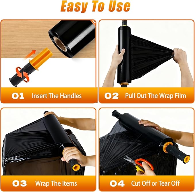 - 【MOVING & STORAGE】 This Stretch Wrap has 2 rolls stretch film and 2 plastic handles. The plastic film are 15 inches wide x 1000 feet length and it features thick 60 gauge wraps. Perfect for both industrial and personal use. Whether you pack cargo pallets for transportation, wrap furniture, boxes, suitcases, christmas tree, securing oddly sharp-edged items. This black stretch packing film will organize, bundles, protects your privacy and holds everything in place.
