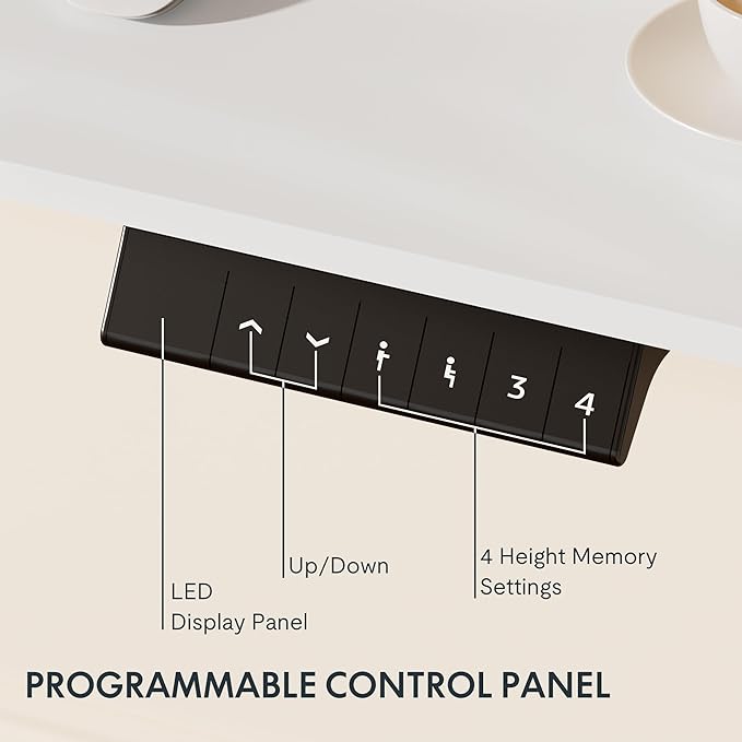 - 4 MEMORY BUTTONS: Easily switch between sitting and standing positions with our 6-button digital controller that features 4 programmable memory presets. The motorized height-adjustable system adjusts smoothly from 28.1” to 45.7”, and the motor runs quietly at less than 50 dB.