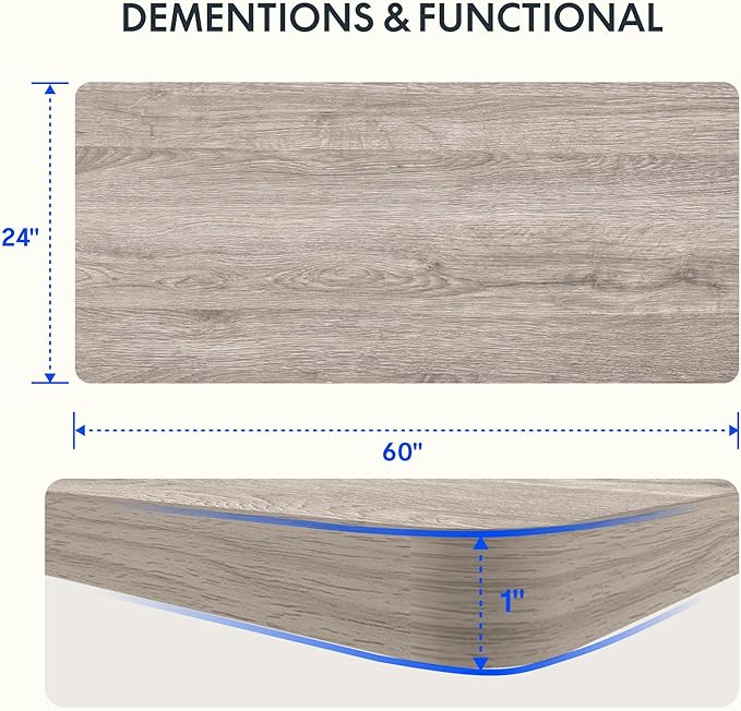 - AMPLE WHOLE-PIECE DESKTOP: With its whole-piece 1” eco-friendly desktop, this standing desk provides plenty of room for your computer setup, documents, and accessories, creating a well-organized and productive work environment. Due to hand measurements, desktop dimensions may vary slightly by 0 to 1”.