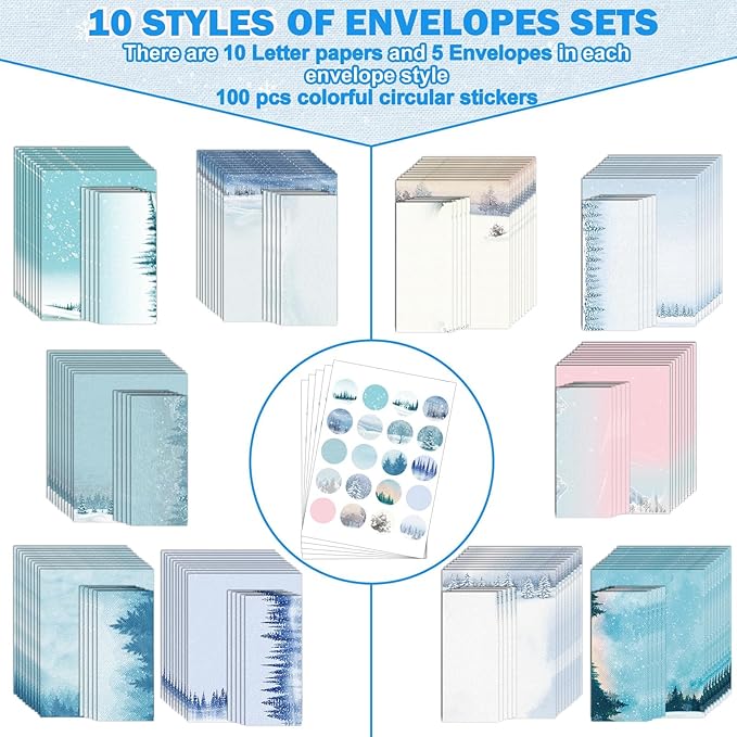 - Winter Holiday Stationery Paper and Envelopes Set: You will receive a complete value set including 100 sheets of beautifully crafted Winter themed stationery paper (8.5x11 inch),100 round dot stickers,and 50 matching envelopes. This wonderland winter&holiday themed holiday stationery features 10 unique seasonal designs(10 sheets per style),perfect for writing letters,party invitations,classroom activities,or festive notes throughout the season.