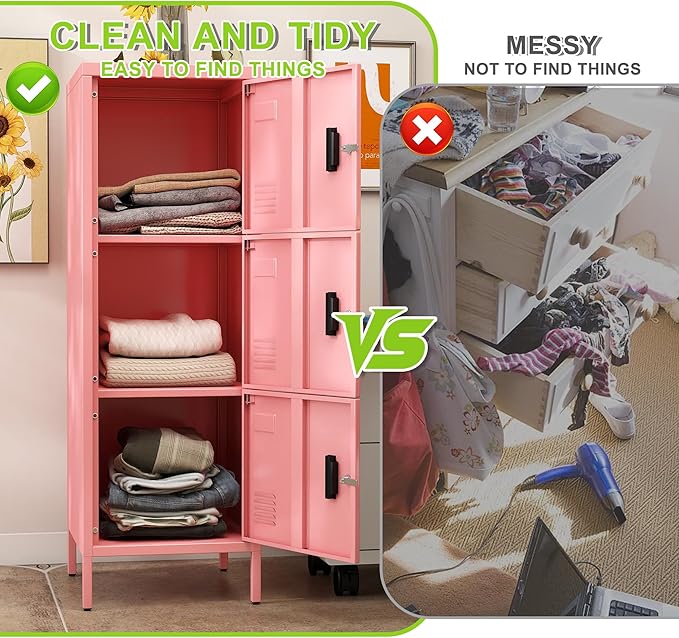 - Sleek Pink Aesthetic:This 3 door metal storage locker in a stylish pink color not only offers secure storage but also adds a modern touch to any home, office, or gym environment. With dimensions of 47.28"H×15.75"W×15.75"D, it provides ample space without taking up too much floor area.