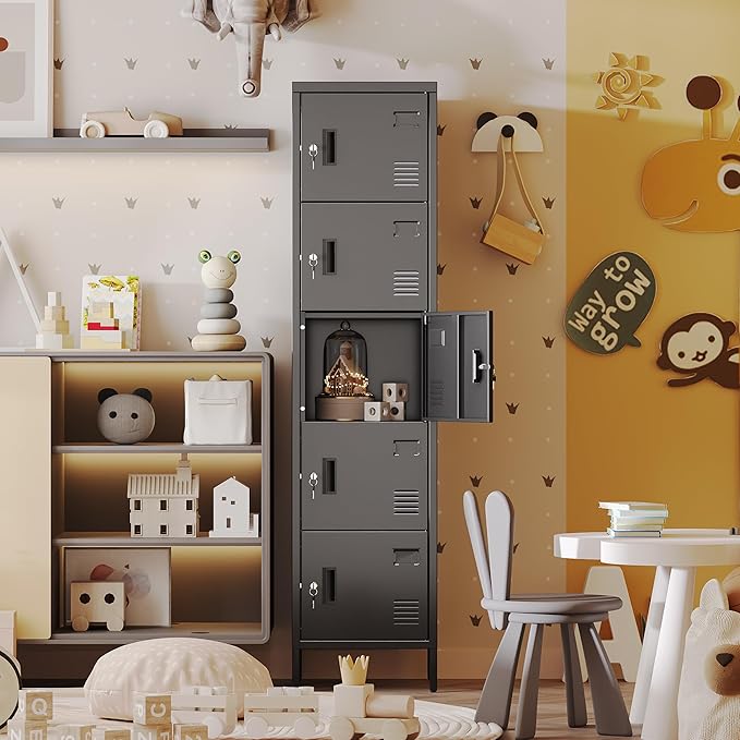 Aobabo 16" W 5 Door Metal Storage Locker with Lock, 66" H Steel Locker with Name Card Holder and Metal Leg for School, Home, Office, Playroom, Assembly Required, Black